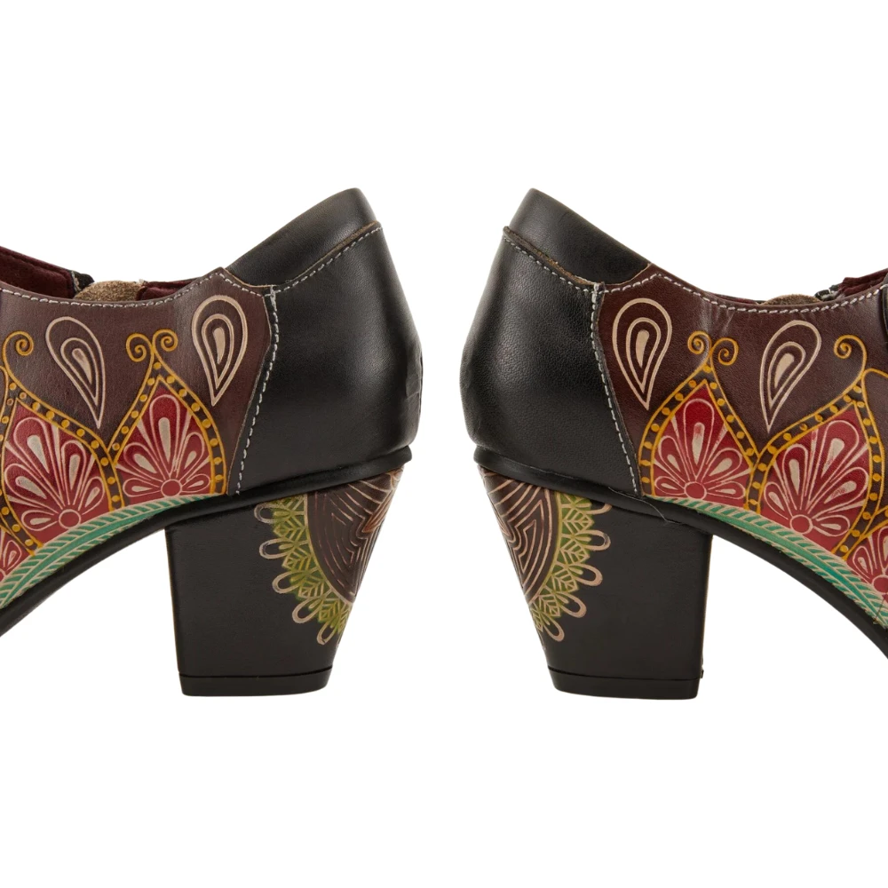 Beautiful painted, burnished, and polished leather cutie with an inside full zip, brushed metal pull tab, and comfort-cushioned top-line, all on an artfully adorned heel!